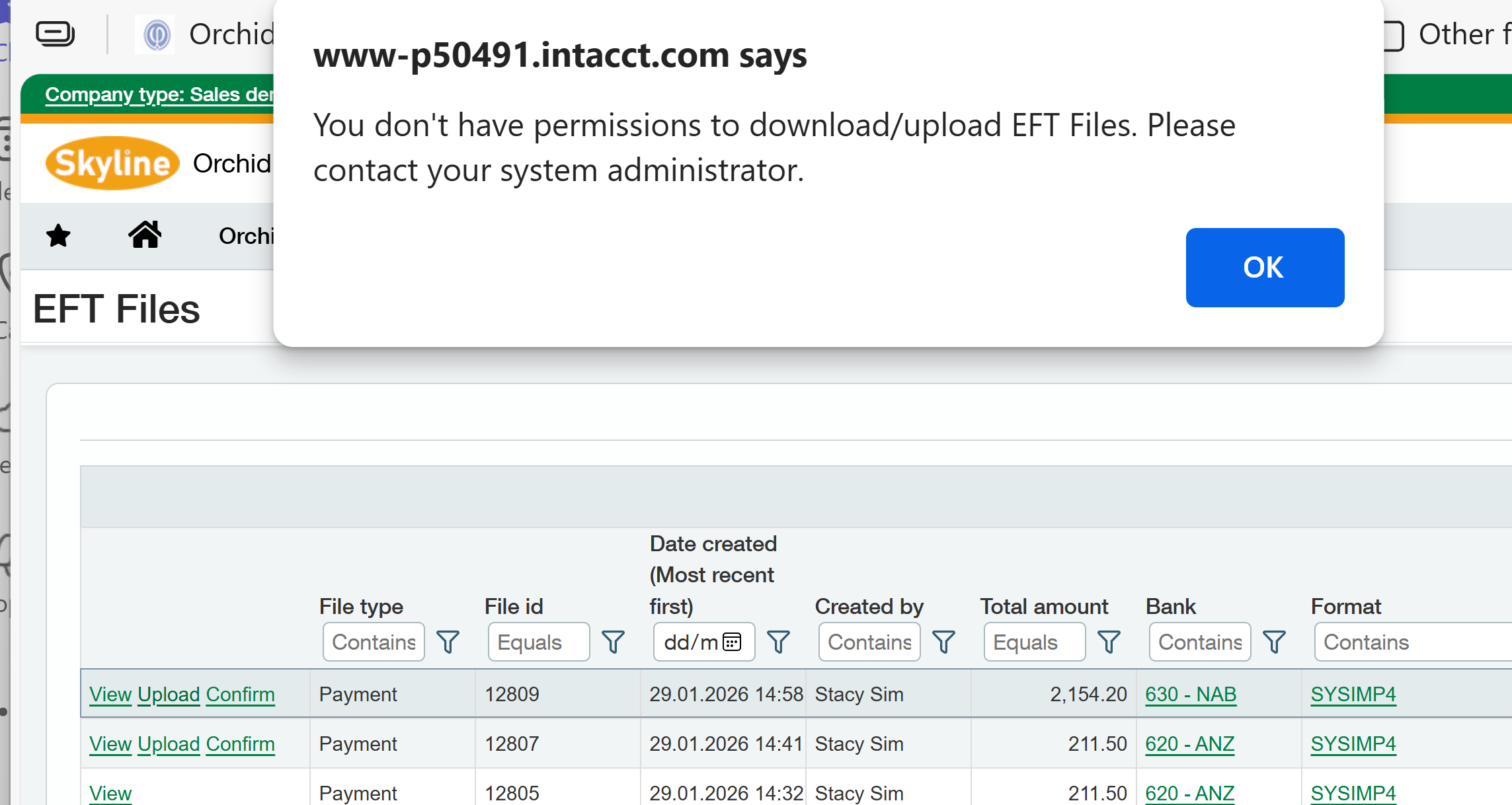 Tip: Typically, you confirm the file in EFT after the bank has processed it successfully and most users don't need to download / upload a confirmed file. This permission applies to admin users.