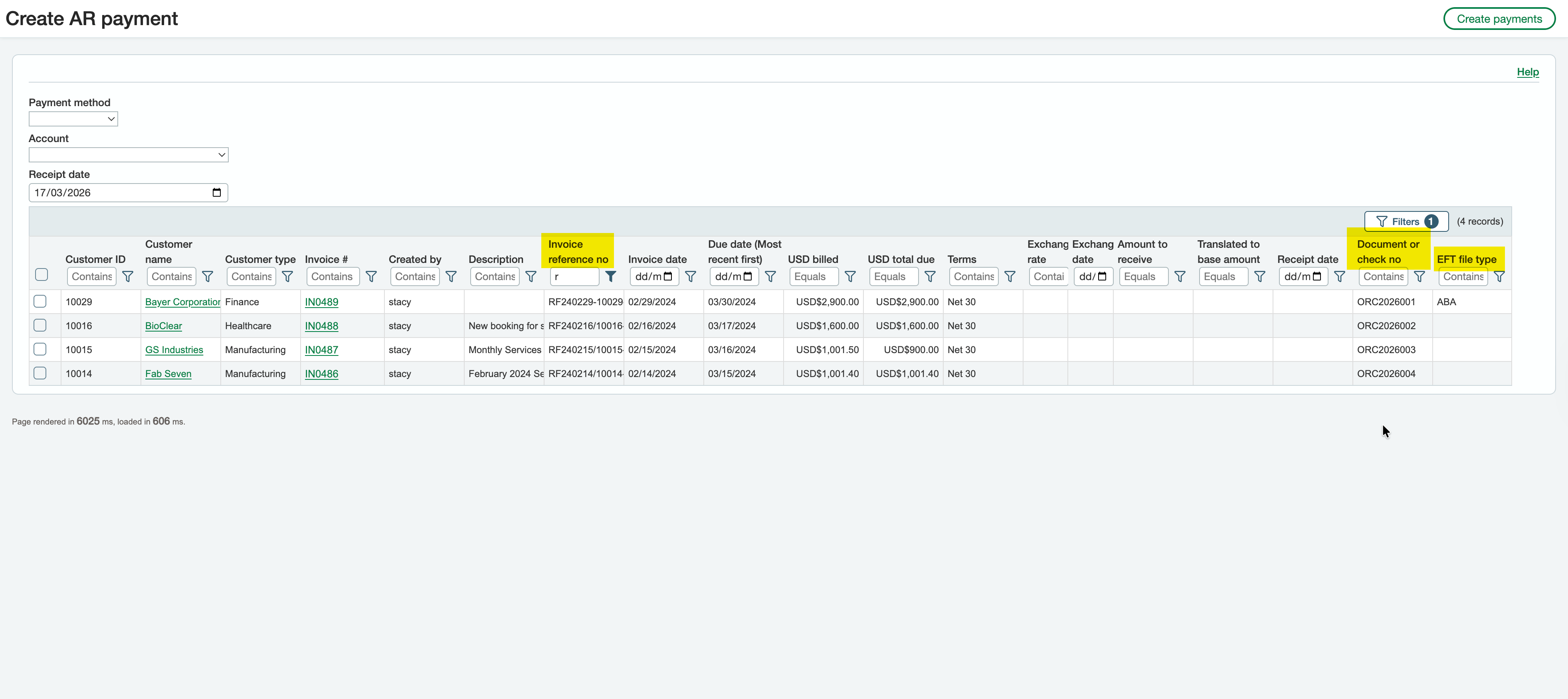 New columns are added in EFTAR Payment Requests and Create AR Payments screens. Filtering and checking records is now easier. This is part of ongoing usability improvements.
