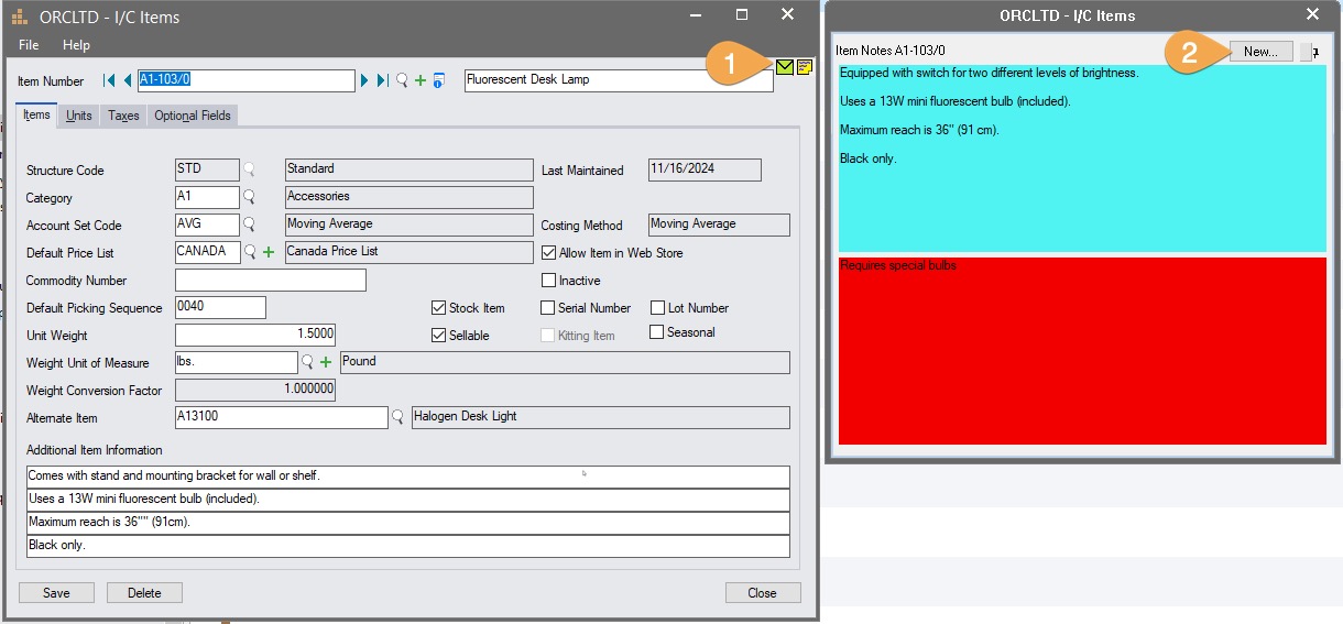 In Inventory Control>I/C Items and Price Lists>Items, select Item Number: A1-103/0: Fluorescent Desk Lamp