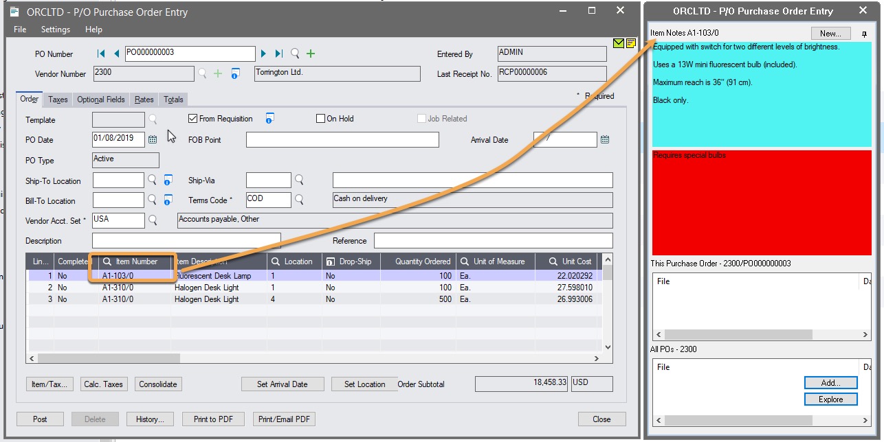 Users want to add Item notes to various Sage 300 Inventory items and view them on the I/C , P/O and O/E Desktop Screens.