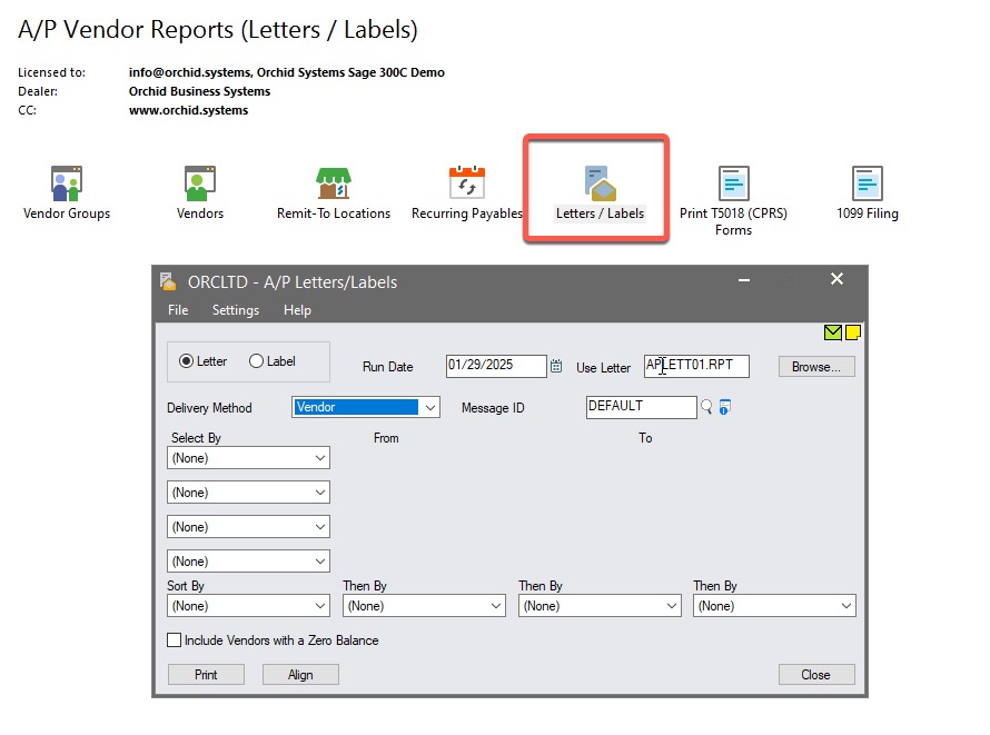 We recommend you use the standard Sage 300 report APLETT01.rpt and create a custom report APLETEFT.rpt. The custom report should include the appropriate fields on the message to be sent to the vendor.
