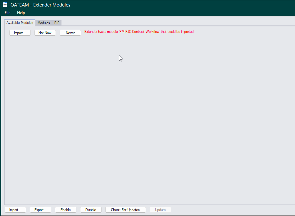 In a new install, you see a list of available modules when you open the Extender Modules screen. The screen lists all the Extender modules included in Extender program files (in the VIxxA folder), that are not yet imported in the database.