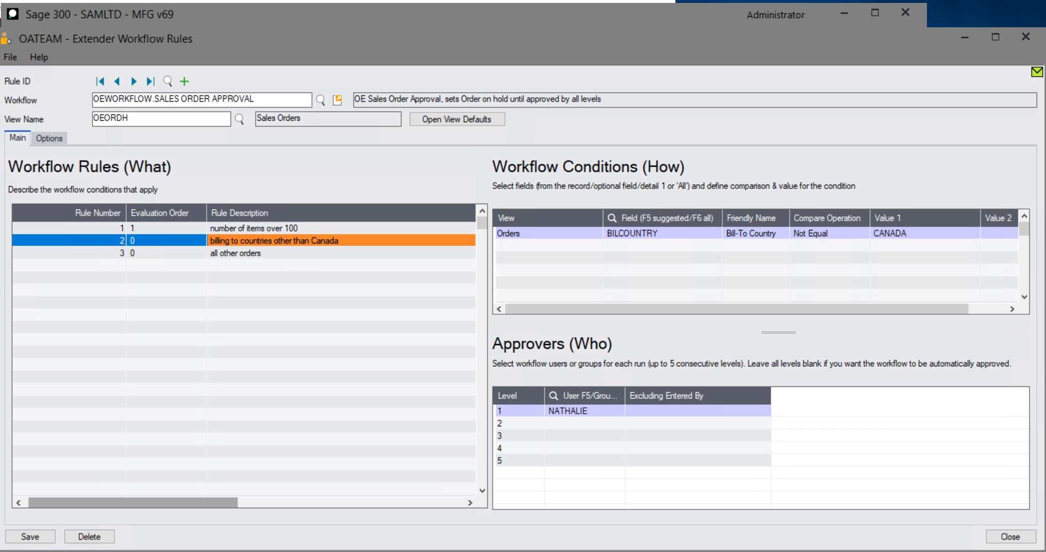 When a user posts a Sales Order , the workflow evaluates the Workflow Rules. If no approval is required, the workflow auto-completes. If the O/E requires one or more approvals, the O/E remains on hold until all users have approved.
