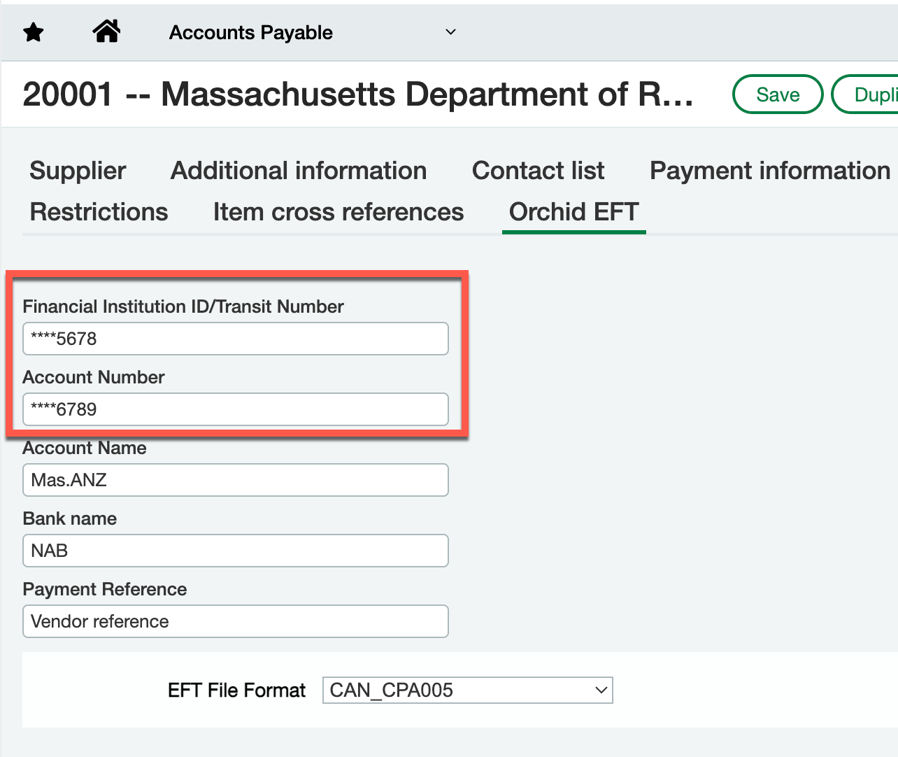 In the EFT File format, you can choose to mask the fields on the Orchid EFT tabs for Vendors, Customers and Employees.