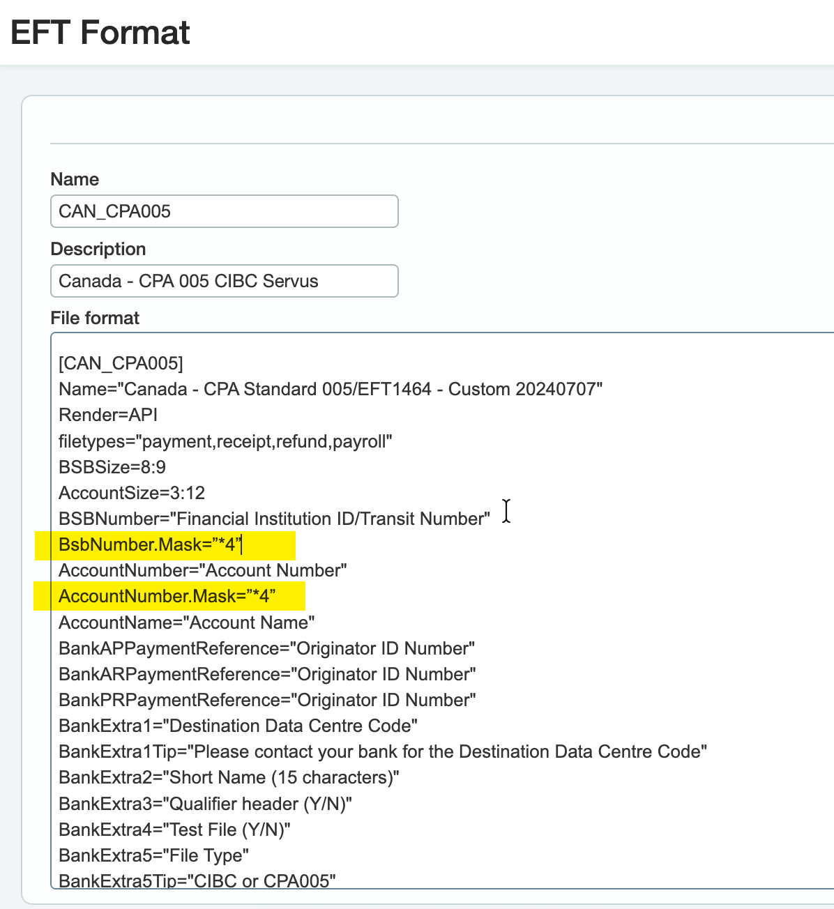 To mask the Bank branch number (BSB of financial institution id) and the account number, add the following two lines to the EFT format: